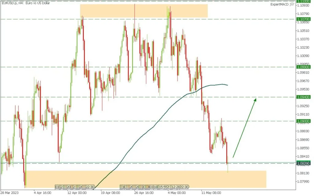 The order block (OB) below the 1.08290 has been reached. After that, a reversal candle appeared. We expect the pair to pull back a little.